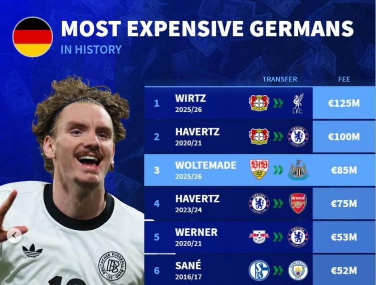 直播吧9月1日讯 沃尔特马德已经官宣加盟纽卡斯尔,《转会市场》统计显示他也是第5位转会费超过5000万欧元的德国球员(哈弗茨两次上榜)。德转列德国籍球员历史转会费榜:欧元维尔茨,勒沃库森→利物浦,1.25亿哈弗茨,勒沃库森→切尔西,1亿沃尔特马德,斯图加特→纽卡斯尔,8500万哈弗茨,切尔西→阿森纳,7500万维尔纳,莱比锡→切尔西,5300万萨内,沙尔克→...